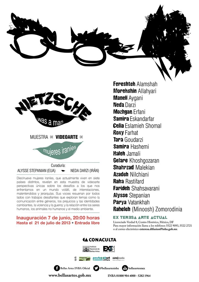 Much debate has been centered around the seemingly misogynistic views of 19th Century German philosopher, Friedrich Nietzsche. A recent rereading of his aphorisms suggests that his remarks were ironic strategies designed to expose the hierarchical dualisms of Western thought and language and gender stereotyping. The title of this show points to the prevalent dualistic patriarchal worldview that subordinates and exploits nature and the powerless, separates men from women, and humans from animals. In this exhibition of video art, 19 Iranian women from 7 countries reveal unique perspectives on the challenges faced in a volatile world of interrelationships, misapprehensions and hierarchies. Their voices resonate around the globe with challenging works that examine issues such as gender communication, prejudice and shifting identities, violence and war, and the relationship between humans, non-human animals, and the environment.