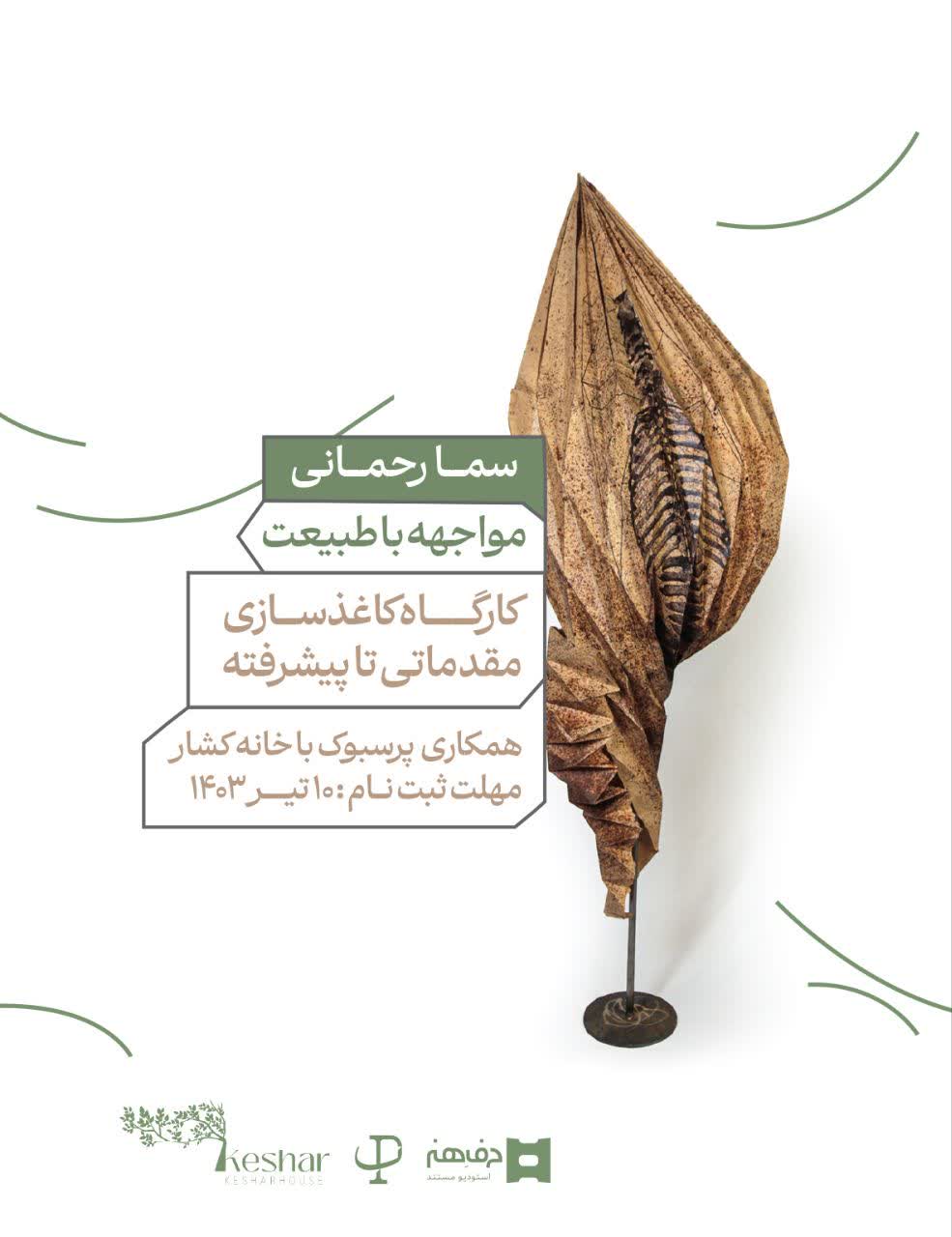 کاغذ پرتکرارترین بستر طراحی در هنر معاصر است. و نقش مهمی درجمعآوری تجربیات واطلاعات برای هنرمندان است. کارگاه با عنوان «مواجهه با طبیعت» برای هنرمندان وهنرجویانی برپا خواهد شد که علاقهمند به تجربه استفاده ازکاغذ به عنوان متریال اصلی در ارائه آثارشان هستند.